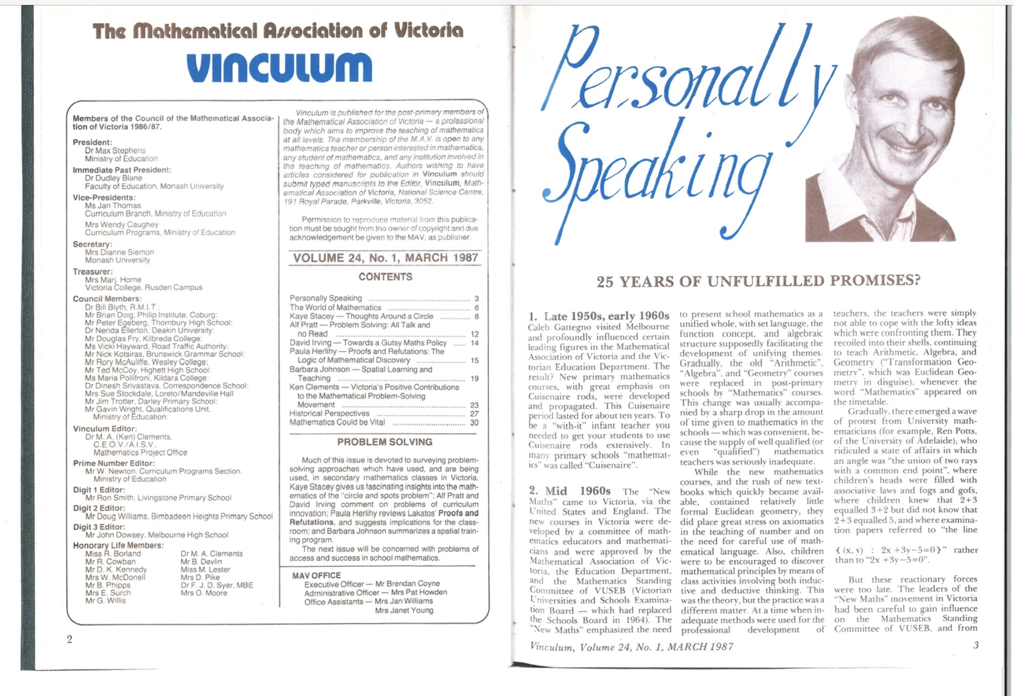 On a personal note, Ken greatly influenced the Clarke family. During Doug Clarke’s DipEd year, Ken’s pointed question, “When are you starting your master’s?”, prompted Doug to begin in his second year of teaching. Ken later employed Barb, Doug, and David Clarke as tutors in mathematics education at Monash, at one point all at once, making for exciting, formative years.