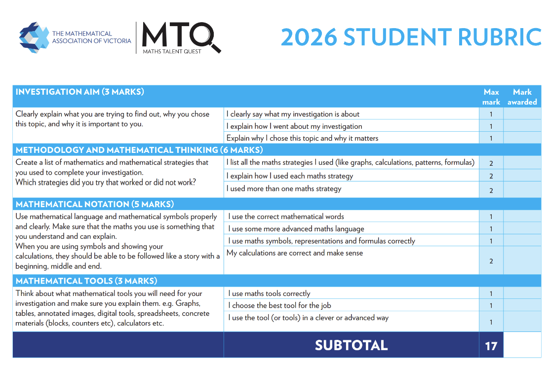 First held in 1982, the MTQ is an annual activity open to all primary and secondary students. Students select their own investigation topic based on their personal learning interests and apply mathematics in context. They understand and discover how mathematics is used and found in the world around them, providing a positive experience that reduces the barriers to learning in mathematics and often reduces student maths anxiety.